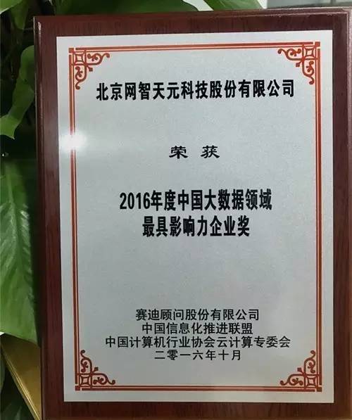网智天元荣获2016年度中国大数据领域最具影响力企业奖