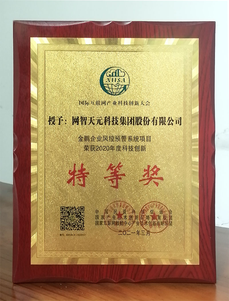 5月13日,国家互联网数据中心产业技术创新战略联盟(以下简称NIISA联盟)对2021第一届国际互联网产业科技创新大会(英文简称:“NIICON”,中文简称:“科创会”)进行了科技创新项目颁奖。在评选工作期间,大会针对征集项目进行了国内外专家初审、现场答辩、专家评审等程序,完成了奖项评选工作。网智天元科技集团股份有限公司的“金鹏企业风控预警系统项目”获得特等奖。